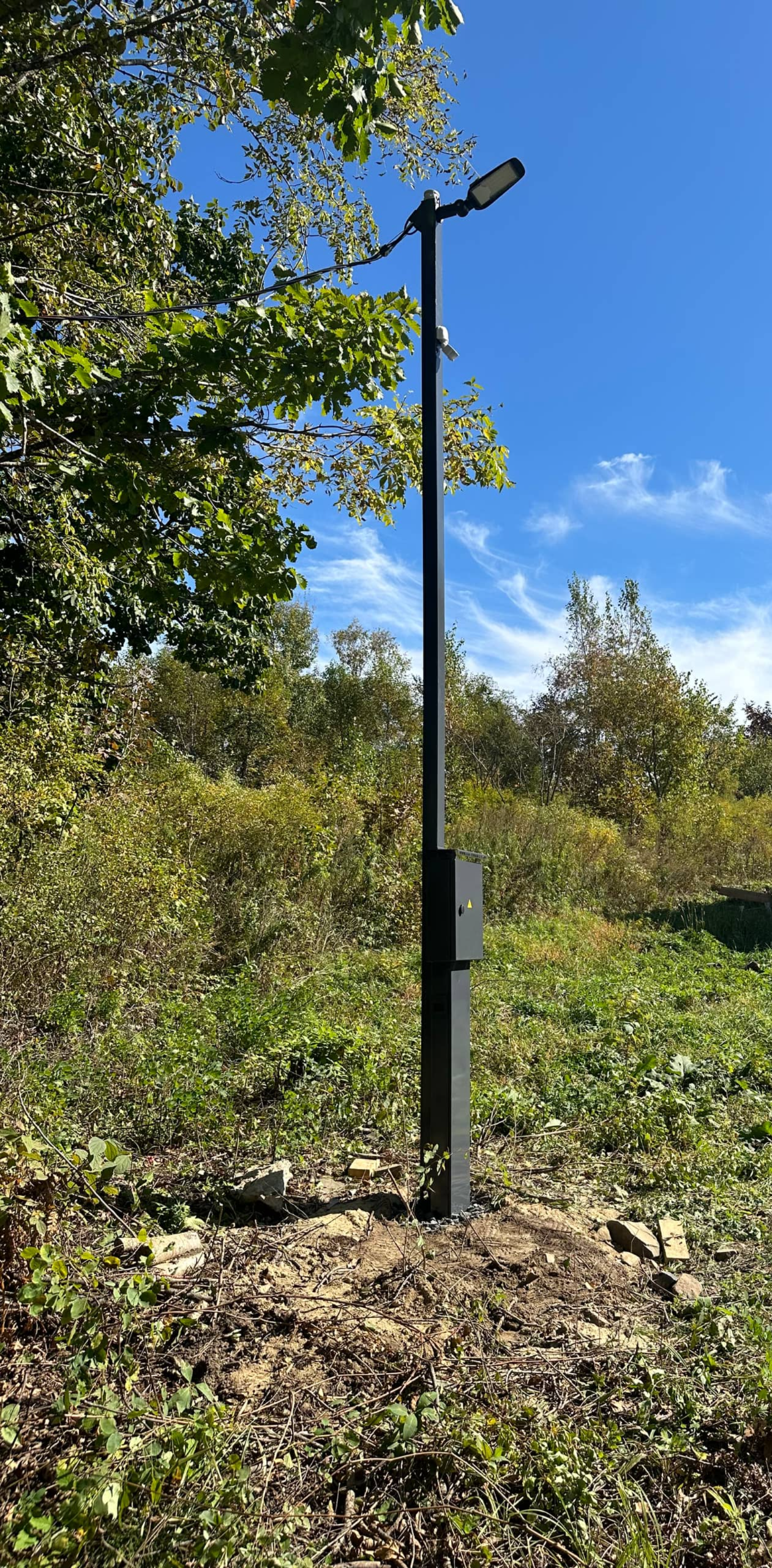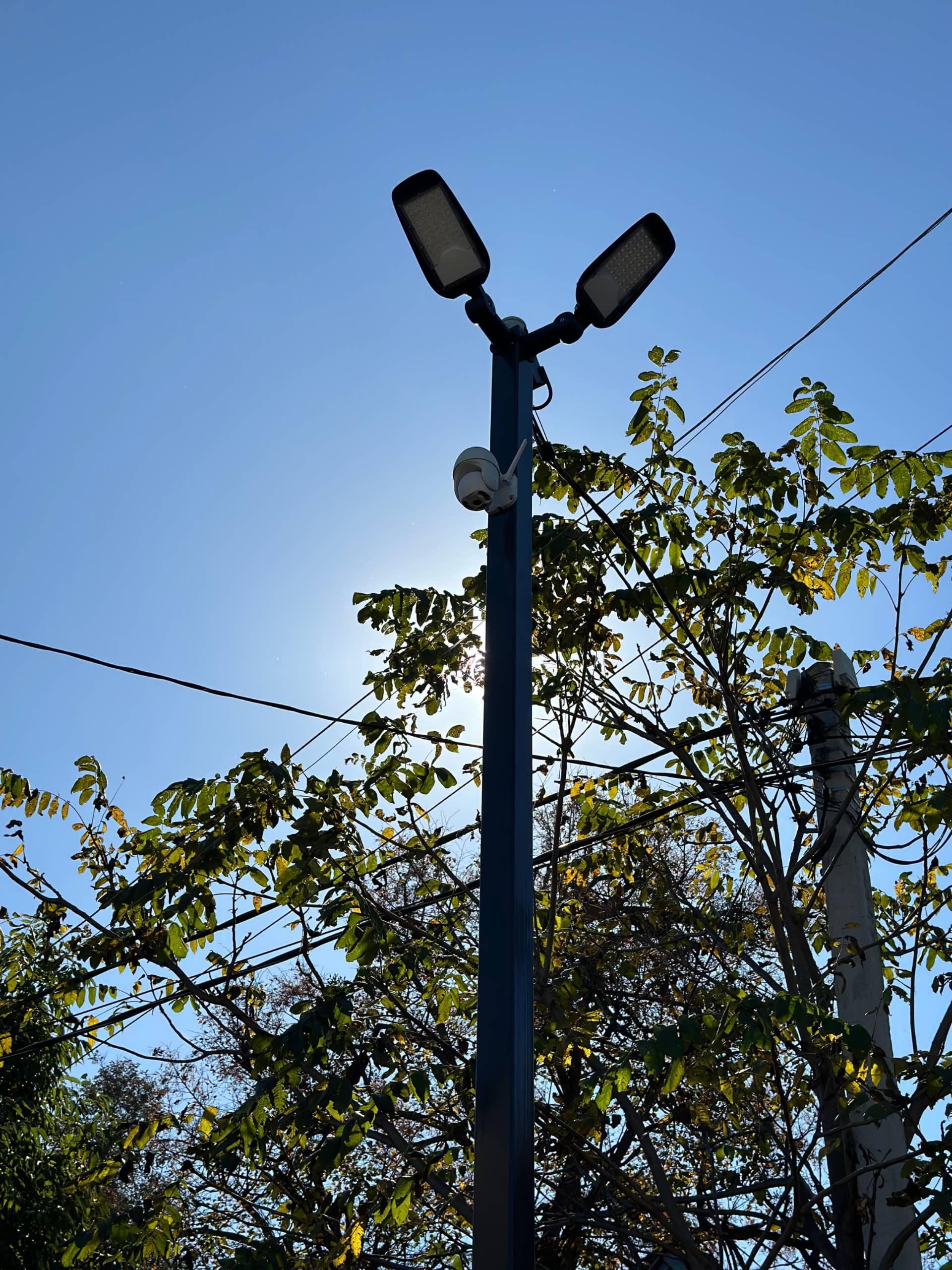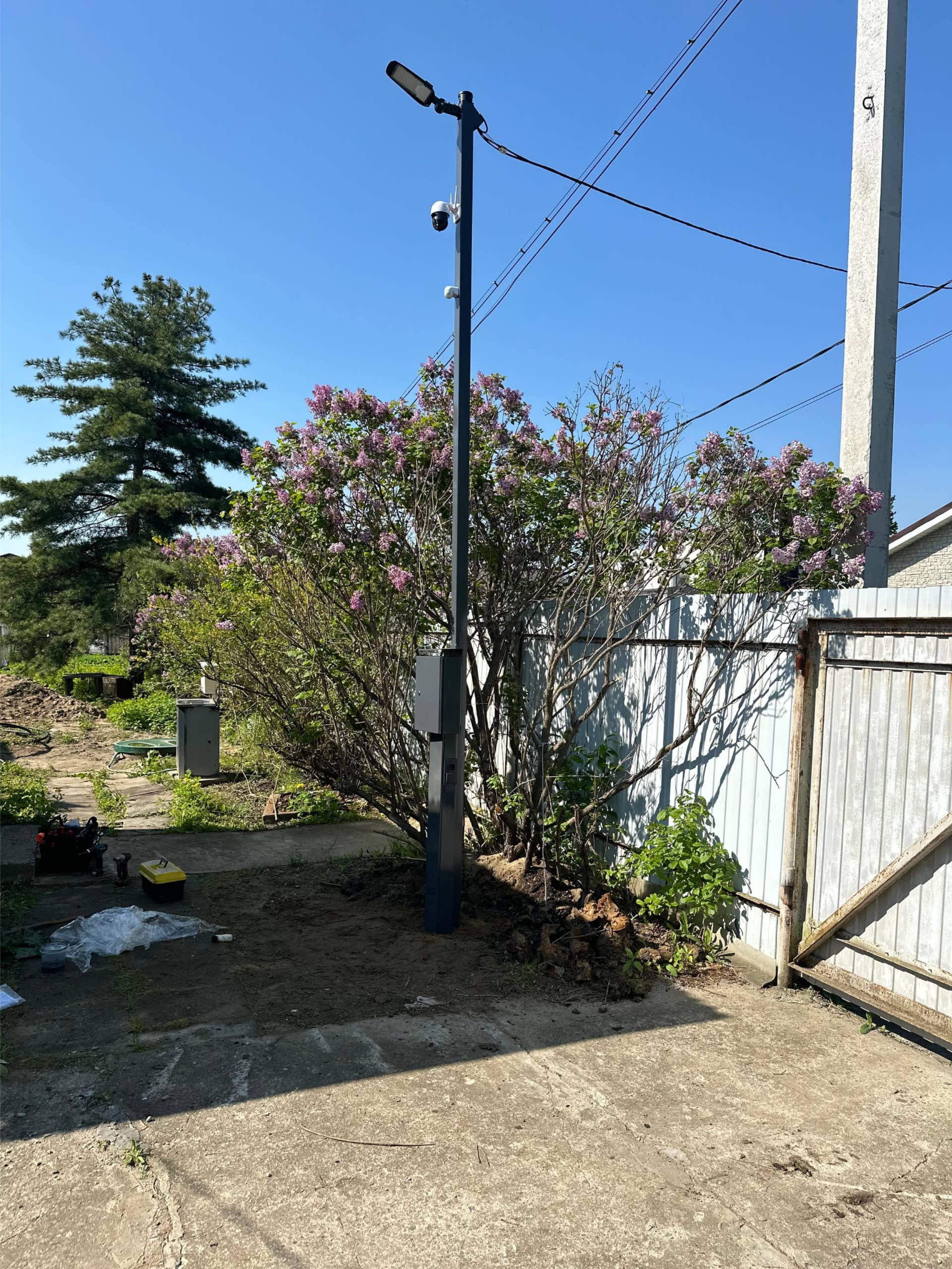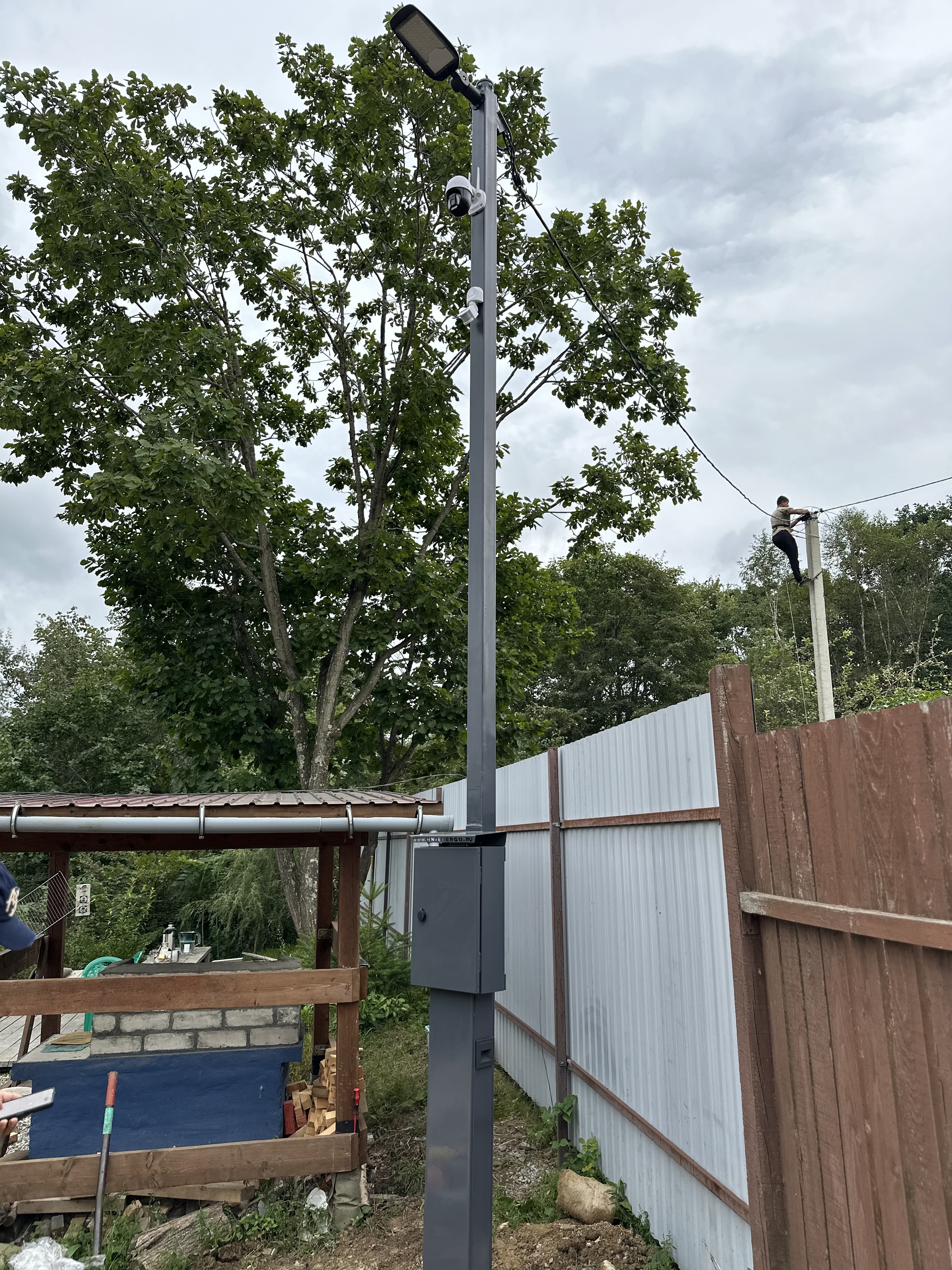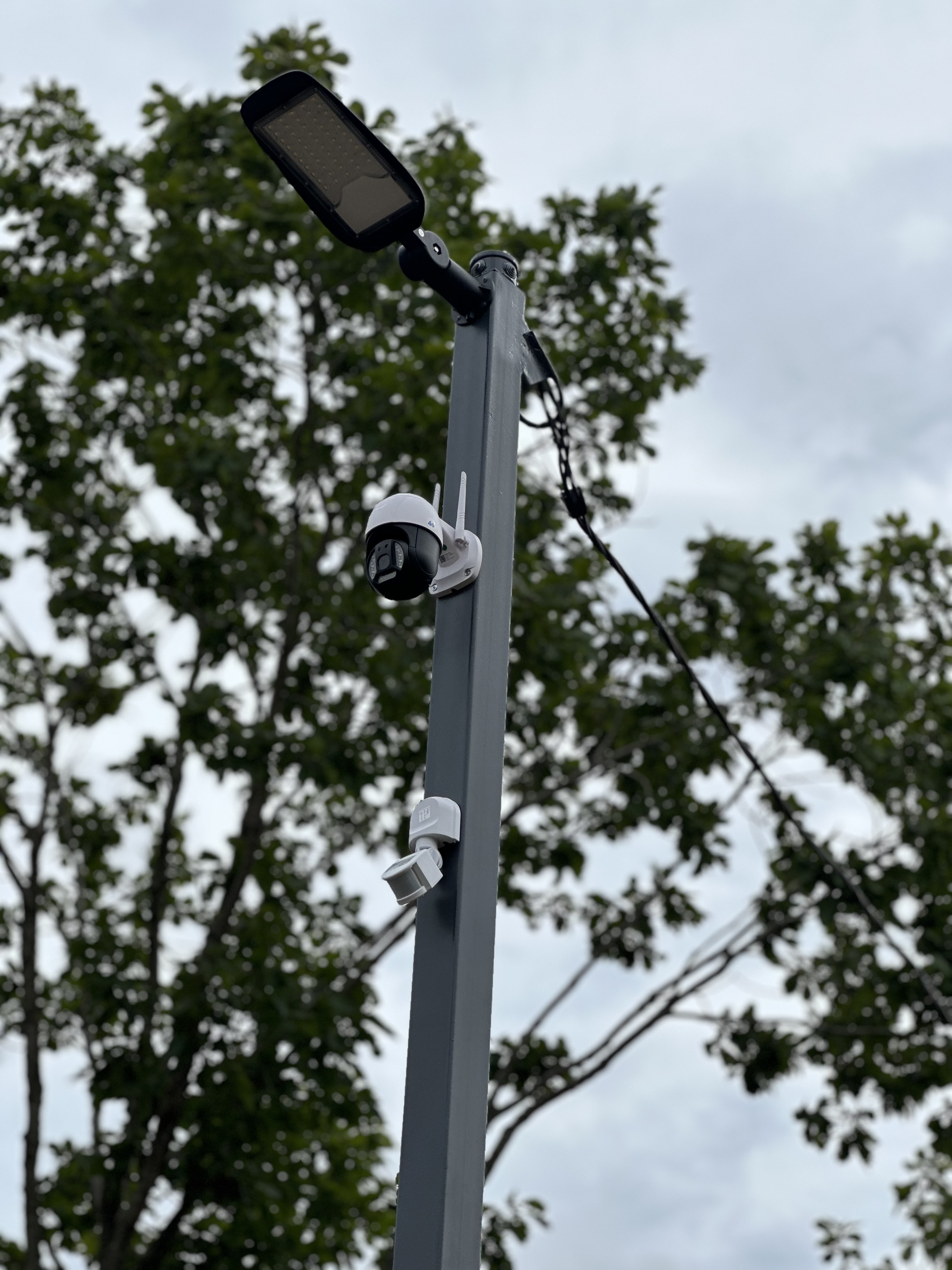 Включает в себя больше возможностей за счет своей высоты, а именно 5 м от земли, что позволяет устанавливать до 3-х камер, круговое освещение, так же на корпусе расположены розетки, подсветка, и выключатель. Провода все скрыты внутри, это позволяет сохранить эстетичный вид.